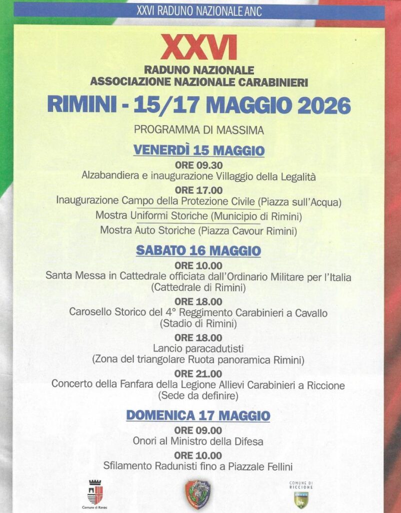 La nostra Sezione sta organizzando la partecipazione al XXVI Raduno Nazionale dell’Associazione Nazionale Carabinieri, in programma a Rimini da venerdì 15 a domenica 17 maggio 2026. La nostra partecipazione è stata programmata nei giorni di sabato e e domenica 17. Tutti i soci interessati sono pregati di mettersi al più presto in contatto con la presidenza al fine di stabilire con certezza il numero dei partecipanti, in modo da permettere la prenotazione per tempo del mezzo di trasporto, della struttura ricettiva e dei luoghi di ristorazione.